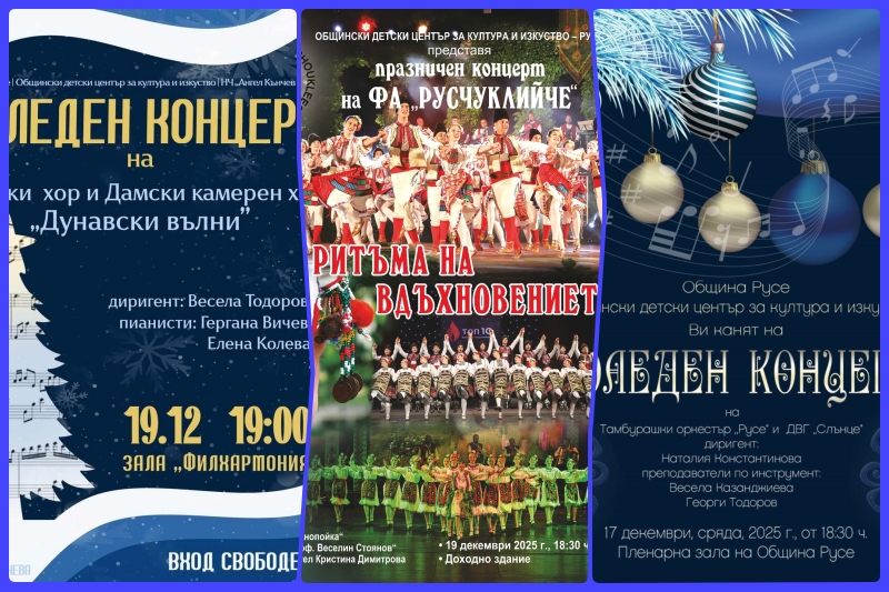 На 17 декември, сряда, от 18:30 часа в Пленарната зала на Община Русе е коледният концерт на Детската вокална група „Слънце“ и Тамбурашкия оркестър „Русе“ с диригент Наталия Константинова и преподаватели по тамбура Весела Казанджиева и Георги Тодоров. Входът за концерта е свободен.