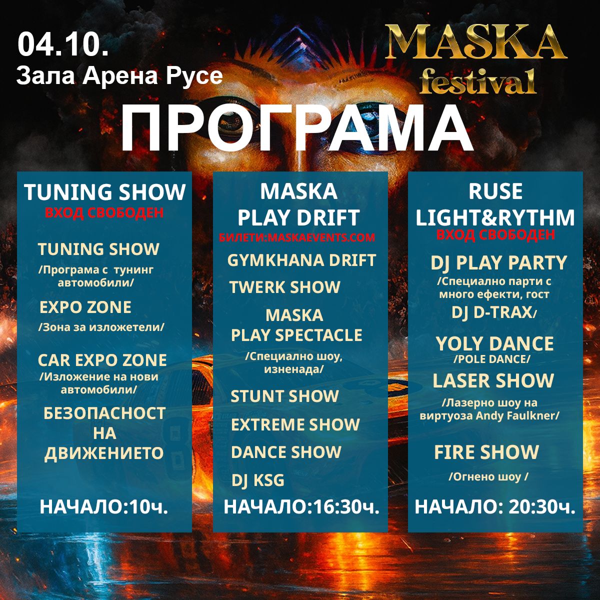 Международният фестивал „MASKA“ ще се проведе на 4 октомври 2025 г. на паркинга на зала „Арена Русе“. Събитието се очаква да превърне Русе в епицентър на тунинг и дрифт културата, като събере на едно място някои от най-впечатляващите модифицирани автомобили, както и професионалисти от България и Румъния. Проявата обещава уникално преживяване, съчетаващо визуални ефекти и шоу на световно ниво. Организаторите от „Маска България“ обясняват, че фестивалът ще отвори нова страница в своята история с амбициозна визия и иновативен подход, като тази година дава възможност на всеки посетител да бъде активен участник в неповторимото преживяване.