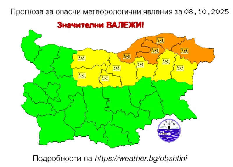 Предупреждението е в сила за областите Плевен, Ловеч, Велико Търново, Русе, Разград, Силистра и Добрич. Други 6 области са под знака на жълтия код – това са Монтана, Враца, Търговище, Шумен, Габрово и Варна.