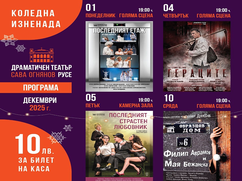 Специален коледен подарък за своите почитатели подготвя Драматичен театър „Сава Огнянов“ в РусеТеатърът ще представи четири вълнуващи спектакъла в предпразничния период, като билетите за тях ще бъдат на промоционална цена от 10 лева. Тази специална оферта е валидна само при закупуване на билети директно от касата на театъра. Не пропускайте възможността да се насладите на незабравими театрални преживявания и да създадете прекрасни спомени в навечерието на Коледа.