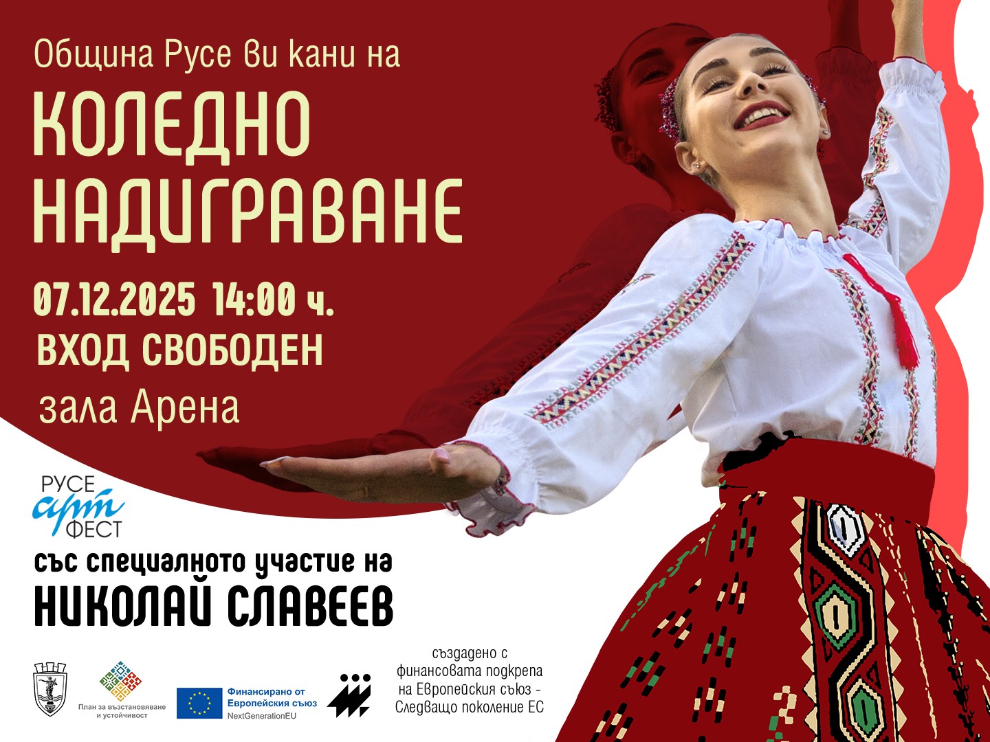 На 7 декември /неделя/ от 14 ч. за втора поредна година и при вход свободен в зала „Арена Русе“ ще се проведе традиционното Коледно надиграване, съобщават от Общината в Русе. Звезда на тазгодишното издание на събитието ще бъде любимият народен изпълнител Николай Славеев, като специално за неговото представяне Танцова школа „Играорци“ ще подготви авторска премиерна хореография.