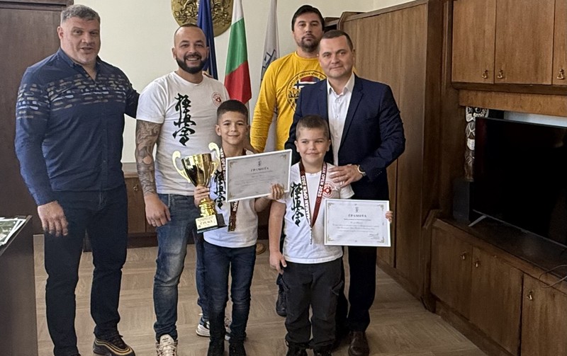 Кметът Пенчо Милков отличи двама възпитаници на Спортен клуб по карате киокушин „Бушин“ за изключителното им представяне на турнира The Romanian Open Bucharest Challenge Cup.
