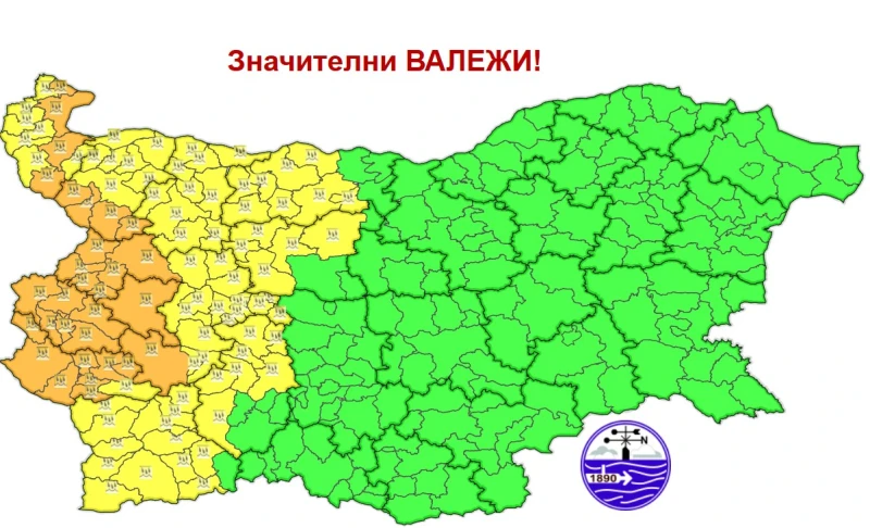 Днес не излизайте без чадър! – предупреждават синоптиците от Националния институт по метеорология и хидрология. За половин България е издадено предупреждение за опасно време. Оранжев код за значителни валежи е обявен за: части от Видин, Монтана, Кюстендил и София-област. Столицата е изцяло оцветена в оранжево. Предупреждение от първа степен е в сила за: части от Видин, Монтана, София-област. Жълтият код е в сила и за Враца, Плевен, Ловеч, Пазарджик и Благоевград.