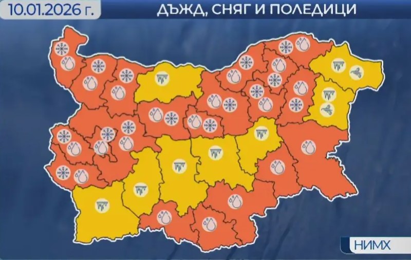 Очакват се обилни валежи от дъжд, сняг и образуване на поледици. В момента в почти цялата страна вали дъжд, а в областите Благоевград, Монтана, Пазарджик, Перник и София – на места го обръща на сняг.