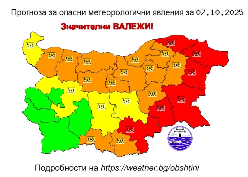 За цяла Южна България днес е в сила предупреждение от втора степен оранжев код за опасно време. В Западна, Централна Северна и Североизточна България в сила е предупреждение от първа степен – жълт код.