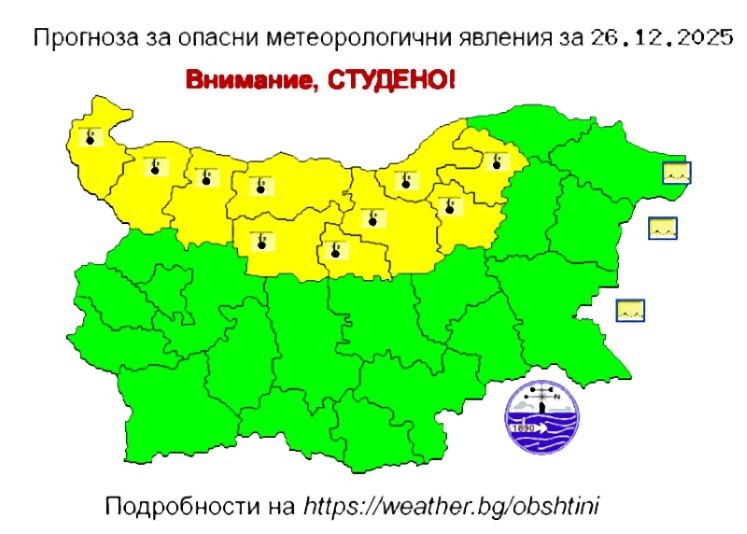 Предупреждение от първа степен за опасно ниски температури издаде Националният институт по метеорология и хидрология. Жълтият код е в сила за 10 области от Северна България, сред които е и Русе. Останалите области са: Видин, Монтана, Враца, Ловеч, Плевен, Търговище, Разград, Велико Търново и Габрово. Живакът в термометрите на тези места ще падне до минус 6 градуса. Очакваната температура в Русе е минус един градуса